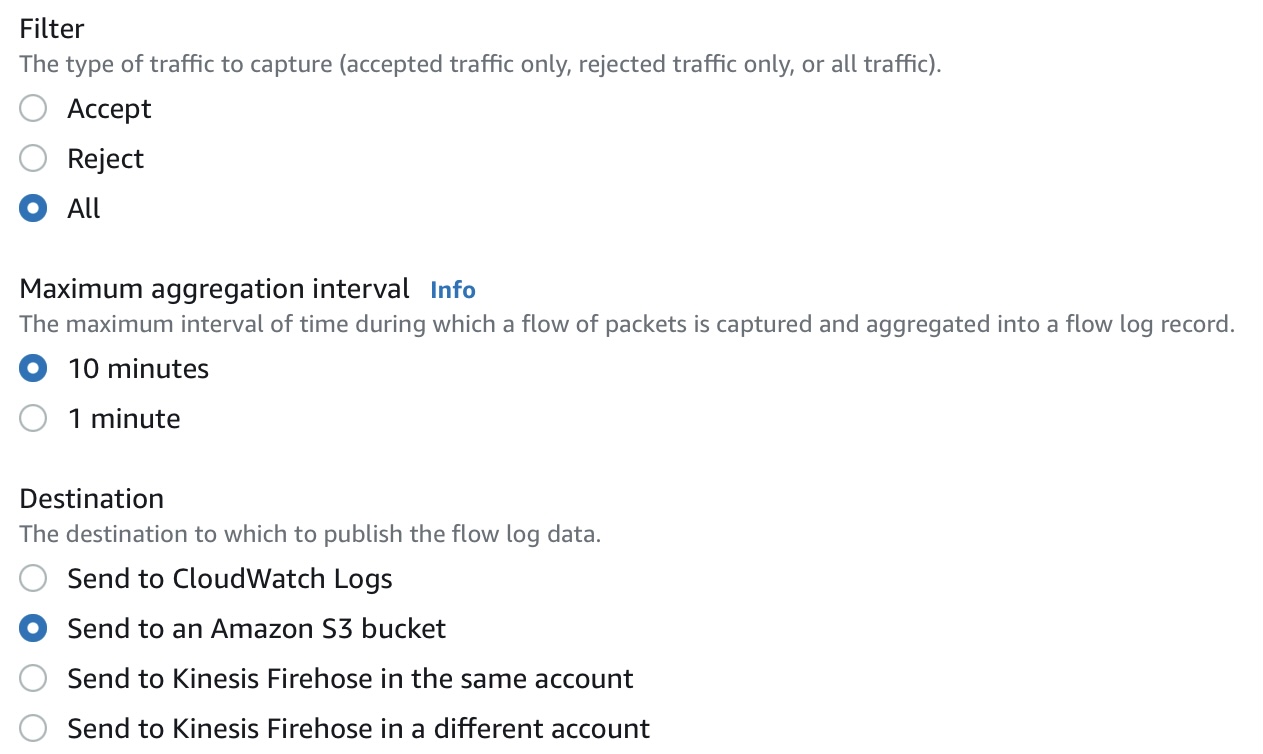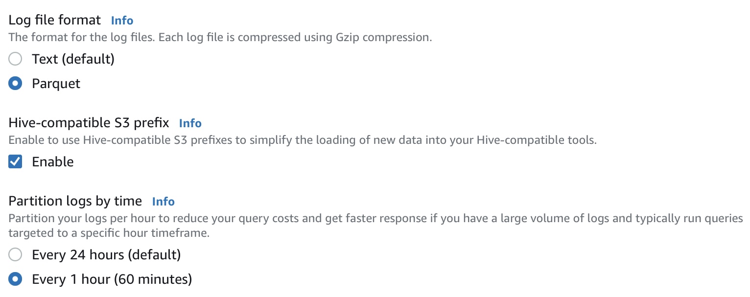 Choose Apache Parquet as the Log format, a columnar data that provides a cost-effective option as Athena bills by the volume of data searched.