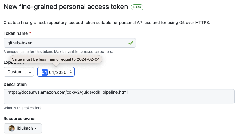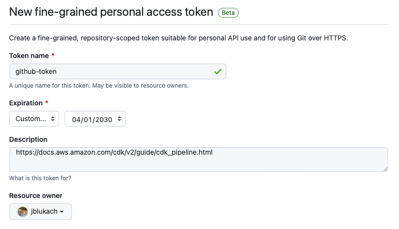 CDK Pipelines requires the token must be stored in an AWS Secret Manager (ASM) secret called github-token.