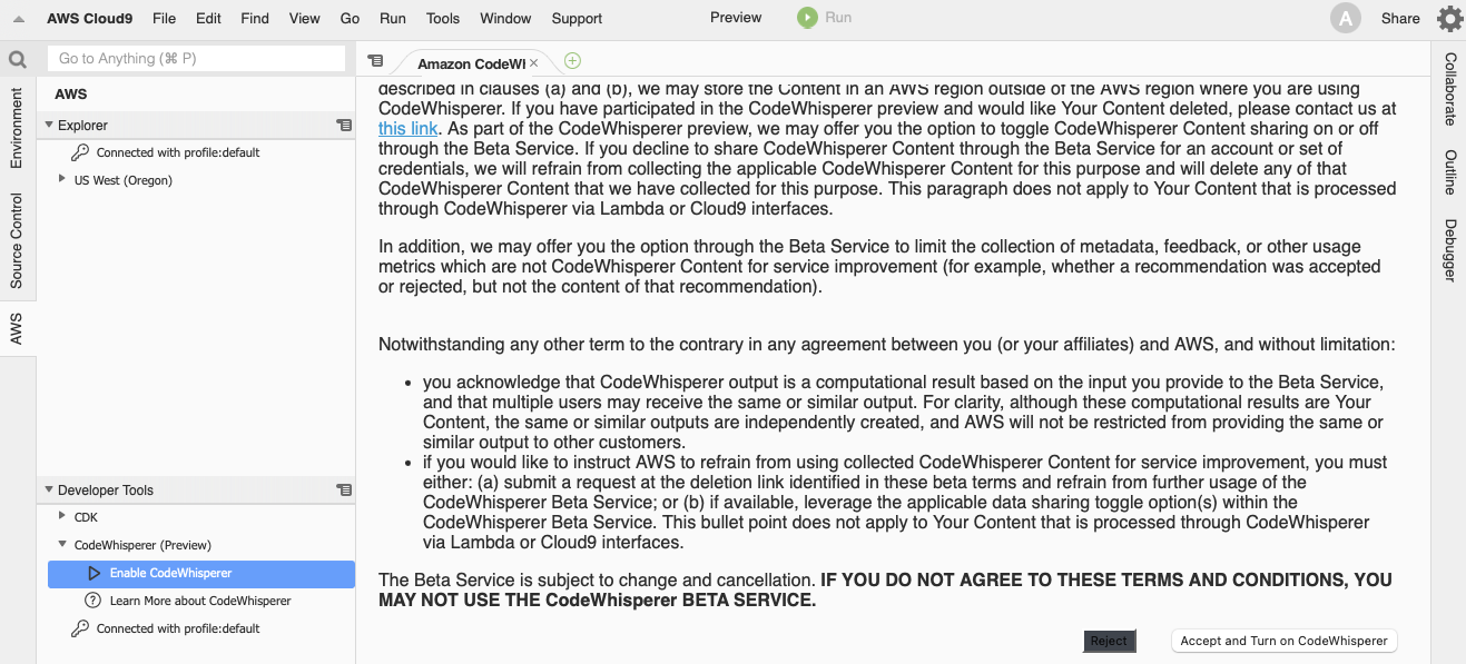 Super simple to enable and accept the CodeWhisperer terms of services from any region with AWS Cloud9 available.