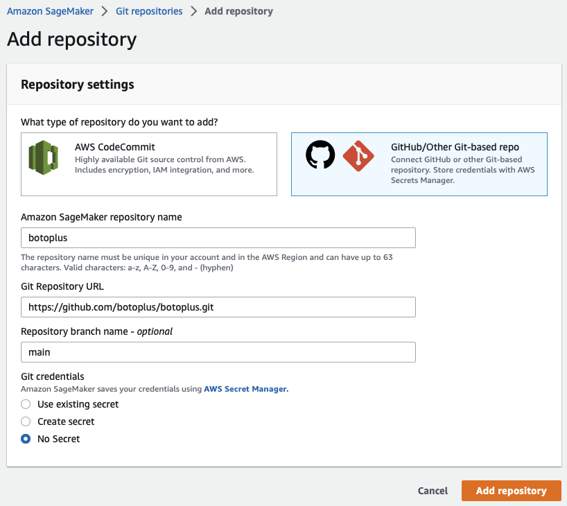Setup access to the public GitHub repository where the Jupyter Notebooks are maintained. GitHub has a fine-grained personal access token (PAT) option allowing storage in AWS Secrets Manager that supports the least privileged usage of private repositories.
