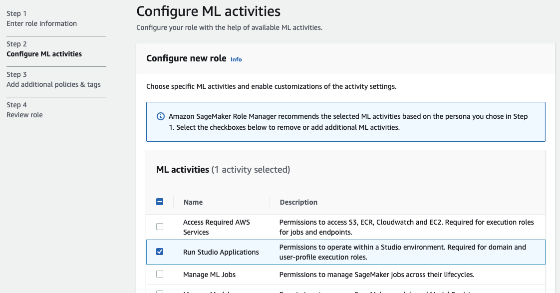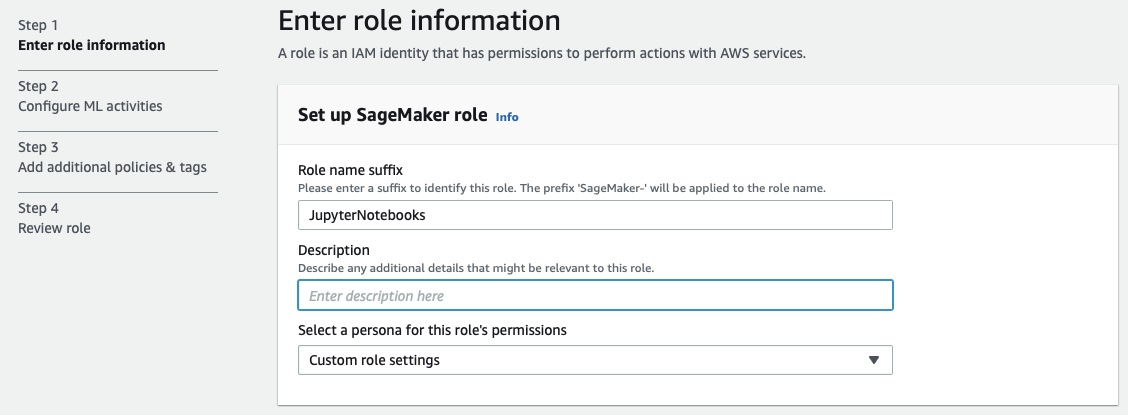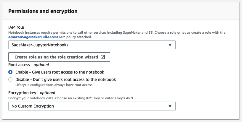 Creating an Identity Access Management (IAM) role will occur while making the first notebook instance. I will use different permissions sets dependent on the resources accessed, but this will minimally get you started just to run Jupyter Notebooks.