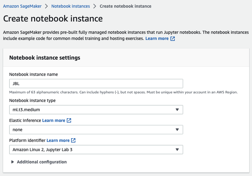 Remember, when creating the notebook instance, the requirements for testing are much different than running in production.