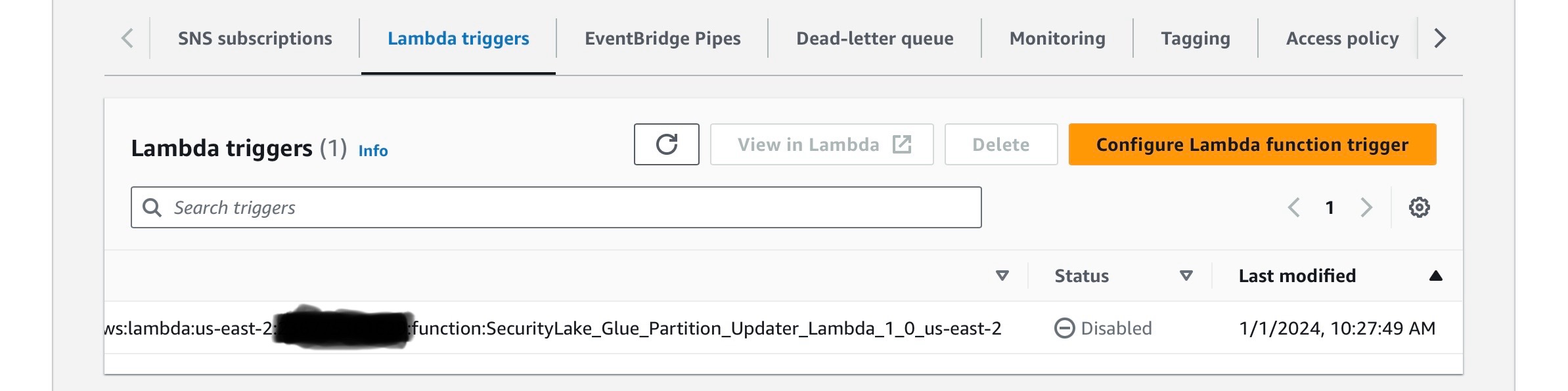 First, the SQS Lambda Trigger for SecurityLake_us-east-2_MAIN_QUEUE_1_0 is not always enabled.