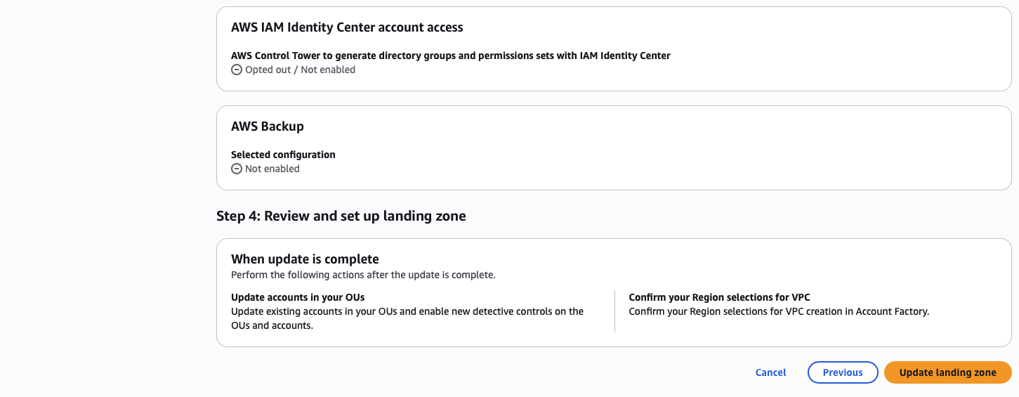 I was hesitant to update my landing zone because disabling Config with Control Tower indicated a breaking change in IAM Identity Center and Security Roles. Too often, AWS Organizations add more and more things to the mix, increasing complexity and the risk of unplanned outages. Just as with development practices, there needs to be at least development and production landing zones to promote operational and security changes for validation testing.