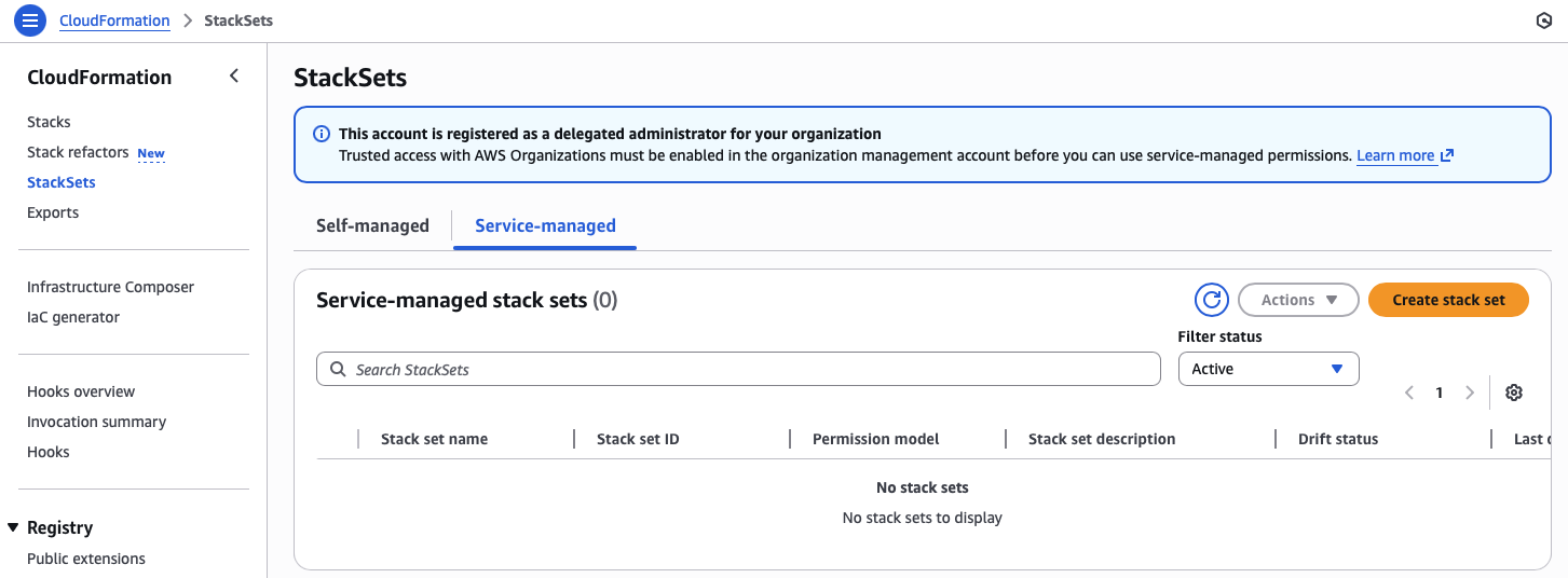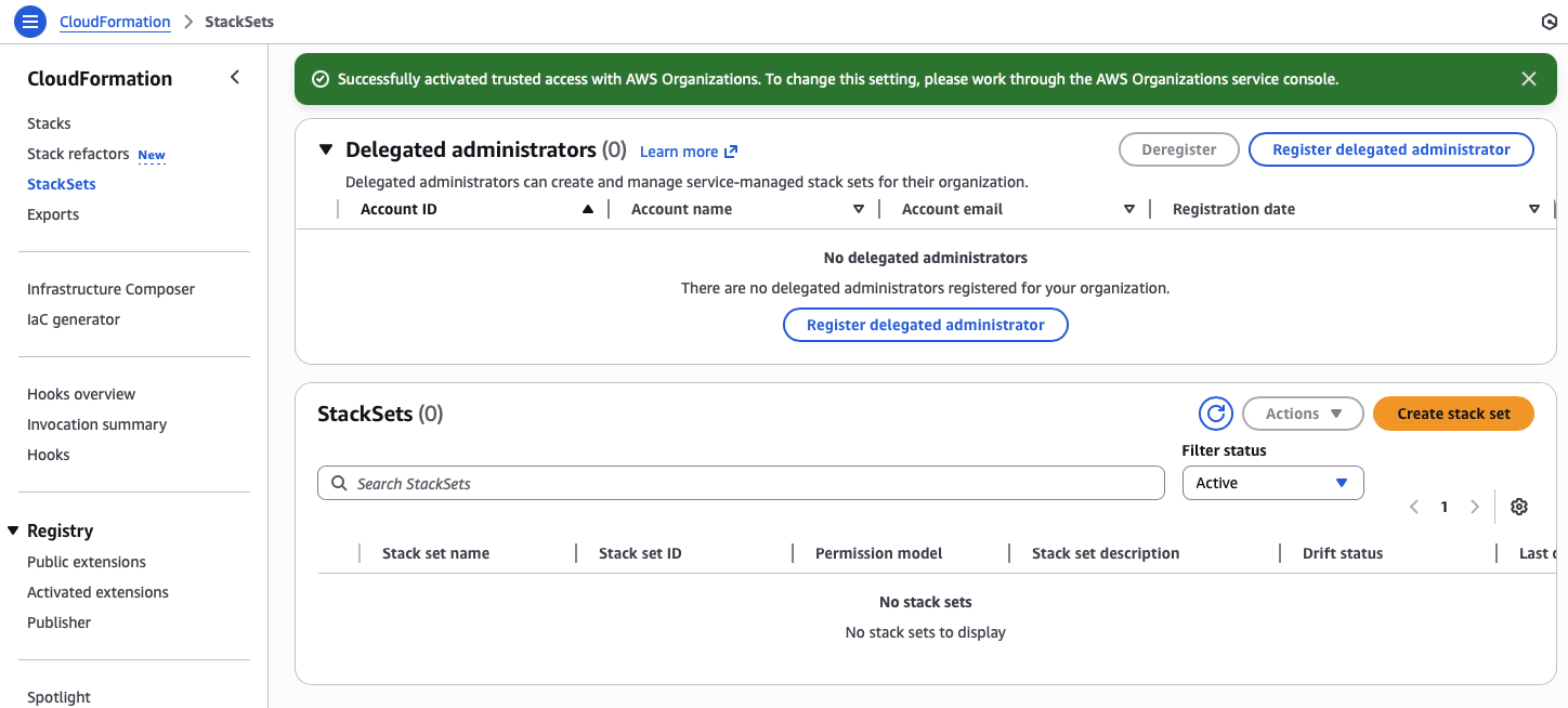 I previously set up a new StackSets account to register the delegated administrator from the management account.