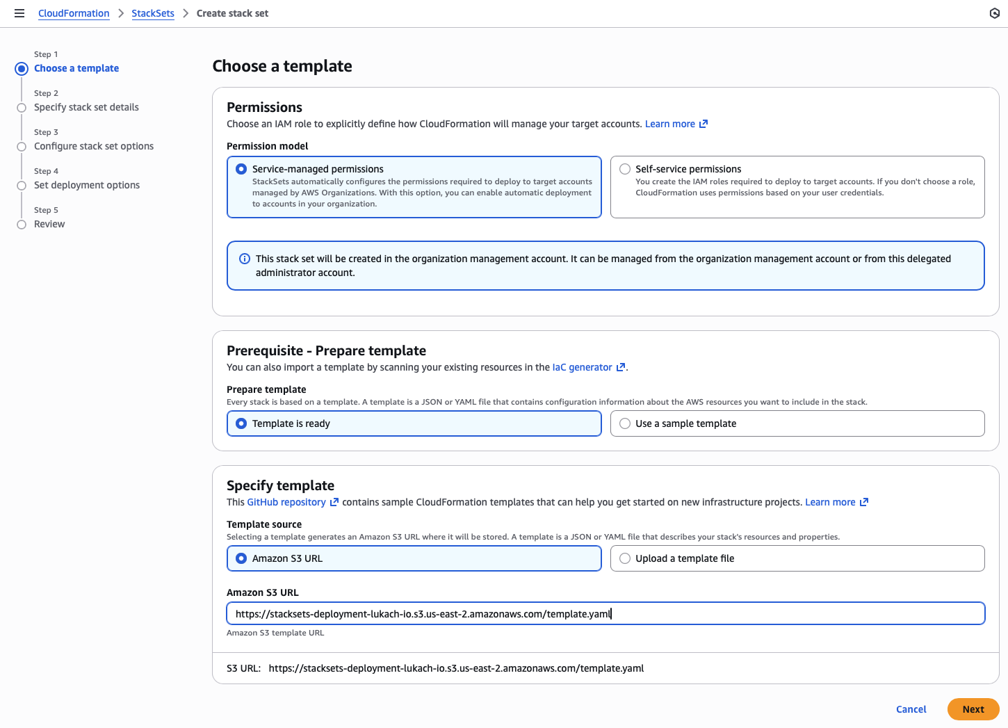 In the StackSets account, I need to create an S3 bucket to host the CDK Bootstrap CloudFormation template.