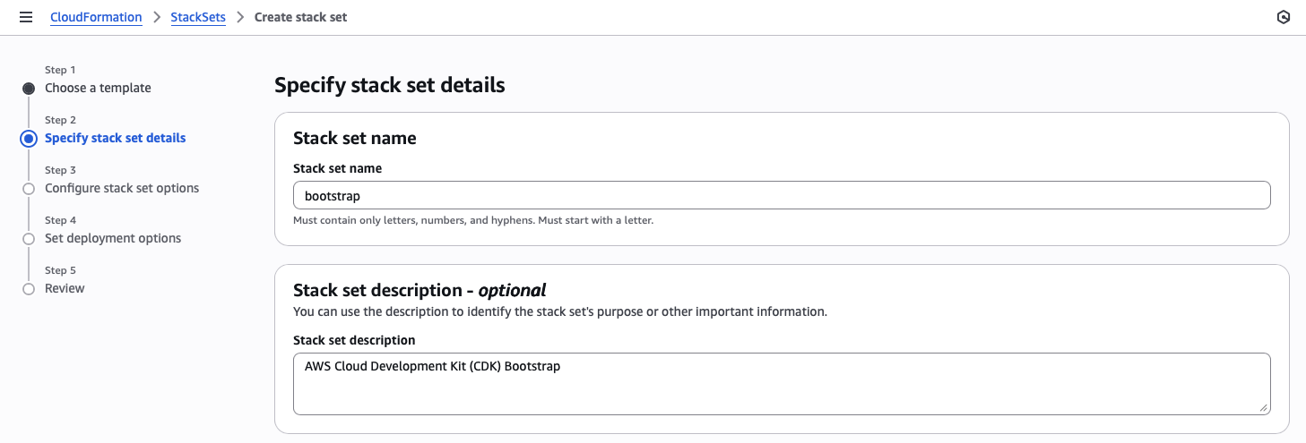 CloudFormation StackSets is used to deploy the Cloud Development Kit (CDK) Bootstrap, which will help me move from ClickOps to Infrastructure-as-Code (IaC). In the management account, I need to enable trust access for the organization.