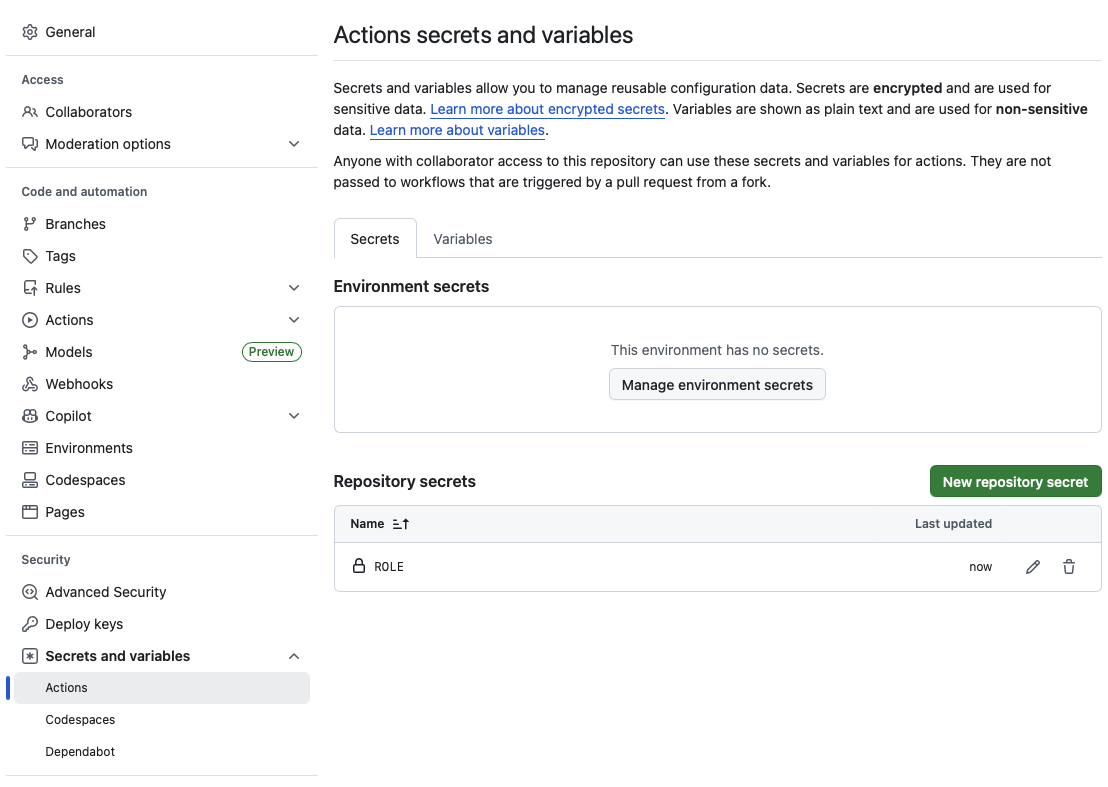 The GitHub Role ARN deployed by the OIDC stack needs to be an Actions Repository Secret for account assumption.