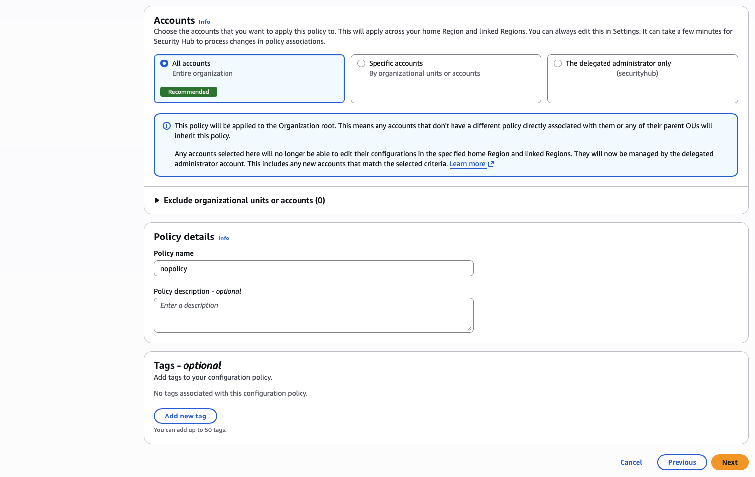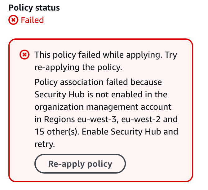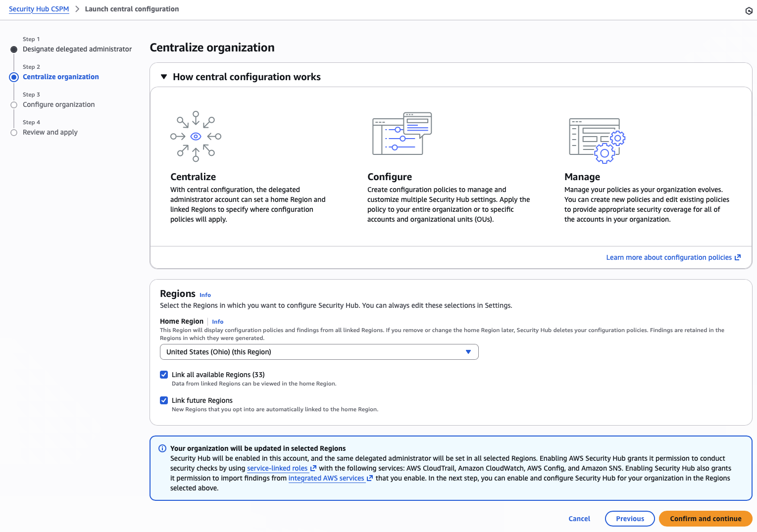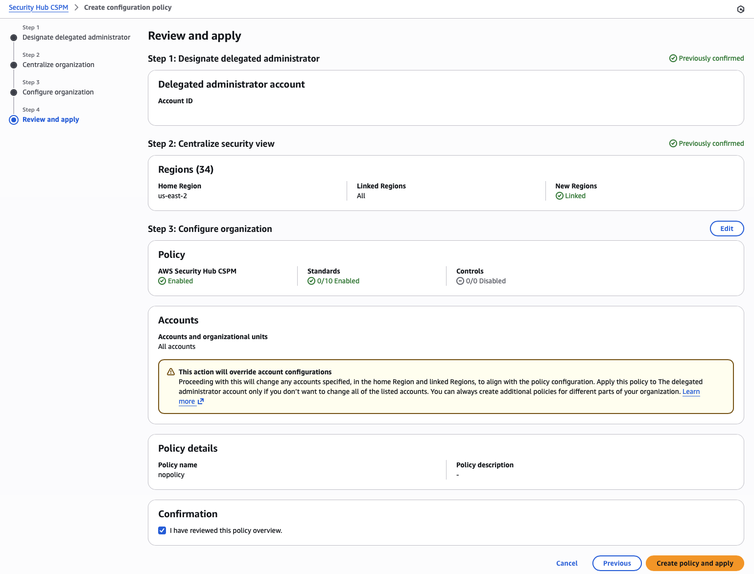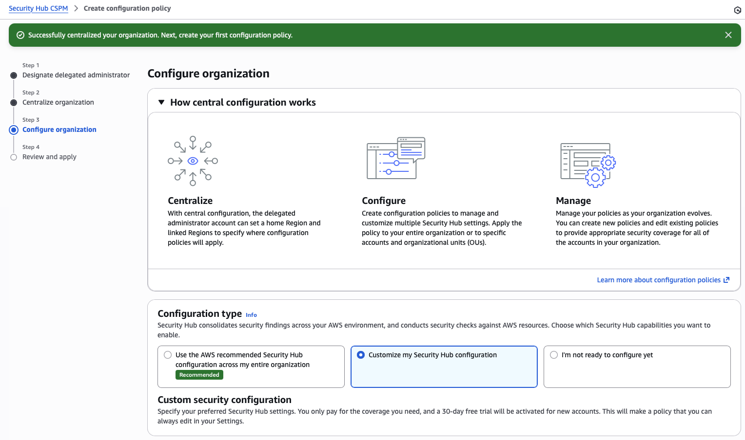 If you receive any errors, you will likely need to remove the centralized configuration policy and the delegated administrator before re-applying.