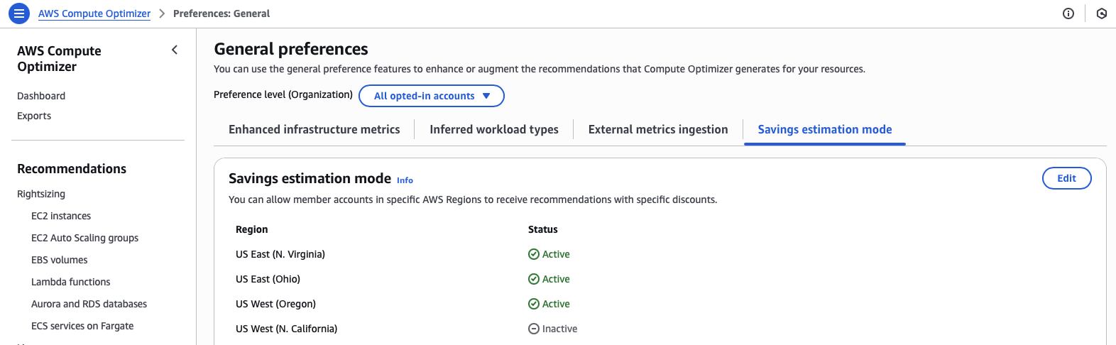 I enabled USE1, USE2, and USW2 to provide savings recommendations.