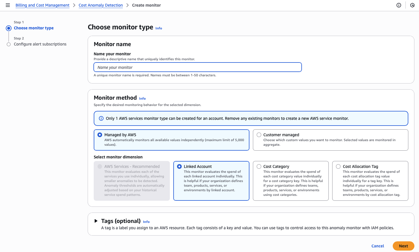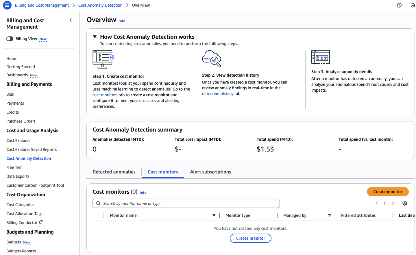AWS automatically created a cost anomaly monitor when I made the new management account. I cleared out the default so I could set up my own.