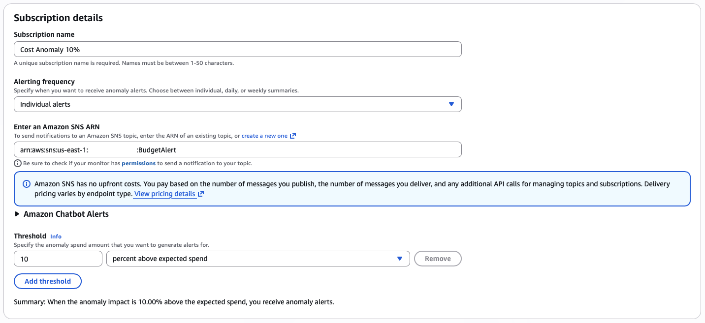 I am interested in being notified of any service cost increases of 10%. I wanted to do increments, but I was only allowed one AWS Services monitor.